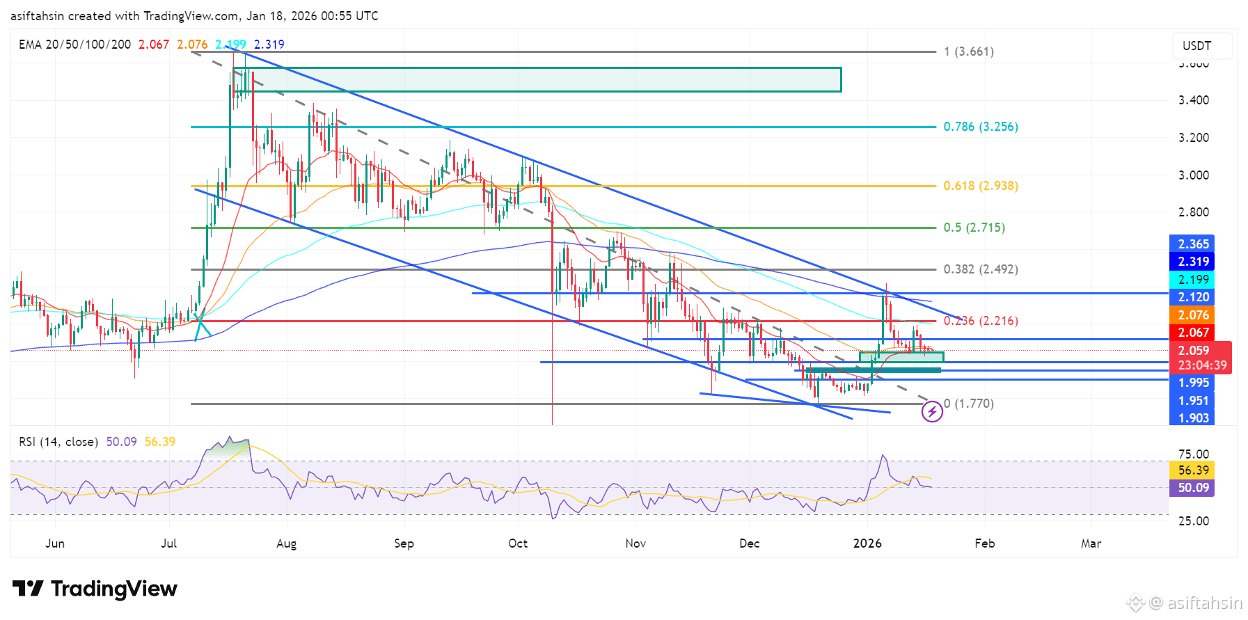Price remains capped beneath the descending channel resistance, confirming the current move as a counter-trend relief rally. A decisive breakout and acceptance above the channel, combined with reclaiming $2.32–$2.49, would be required to confirm a trend reversal.