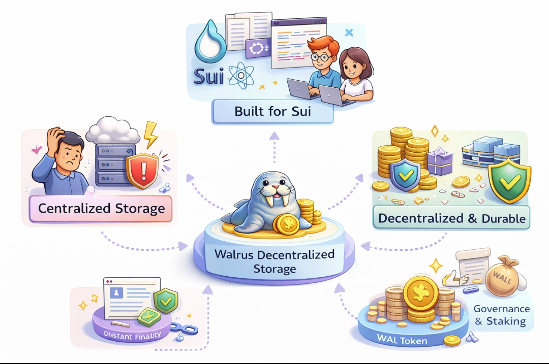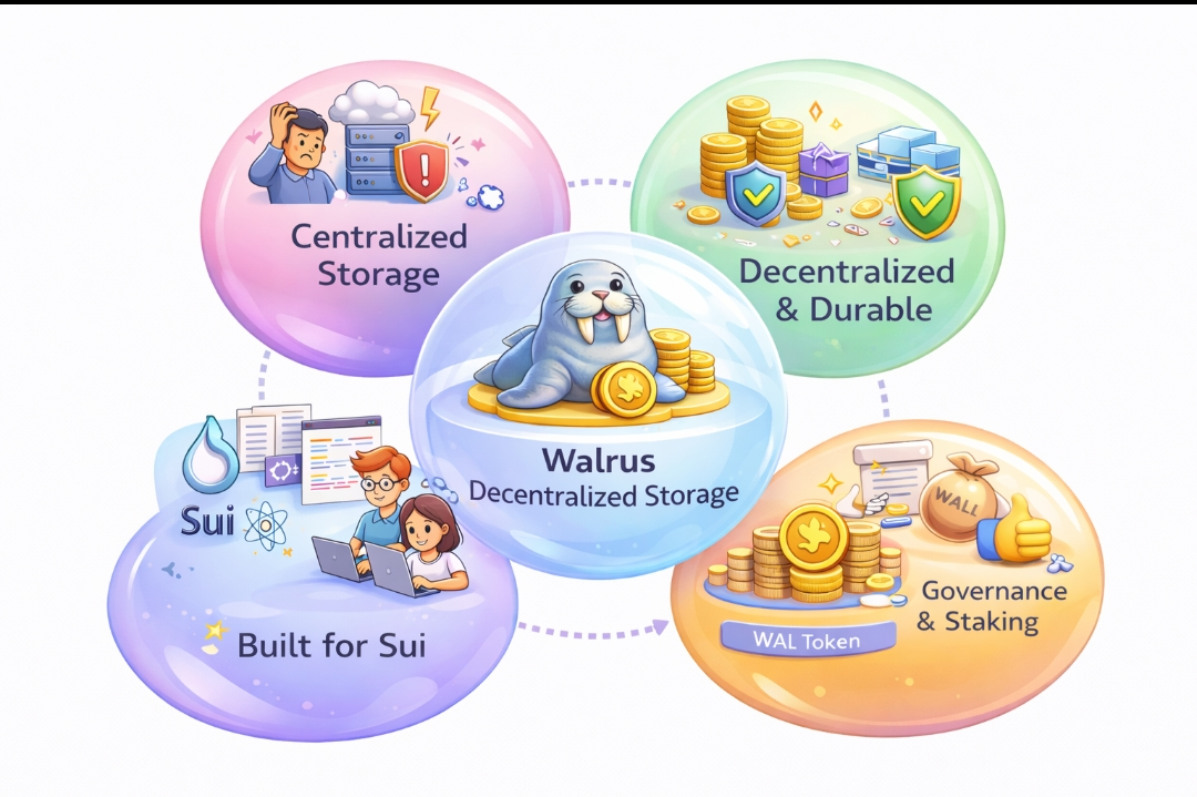 Ce qu'il essaie de résoudre n'est pas abstrait. C'est très pratique. Les applications ont besoin d'un endroit pour placer des données qui ne s'intègrent pas dans des transactions. Images. Fichiers. Contenu des utilisateurs. Des choses qui sont trop grandes, trop fréquentes ou trop désordonnées pour qu'une blockchain puisse les gérer directement. Walrus intervient là-dedans, surtout au sein de l'écosystème Sui, et dit : cette partie devrait aussi être décentralisée, mais sans rendre votre vie plus difficile.