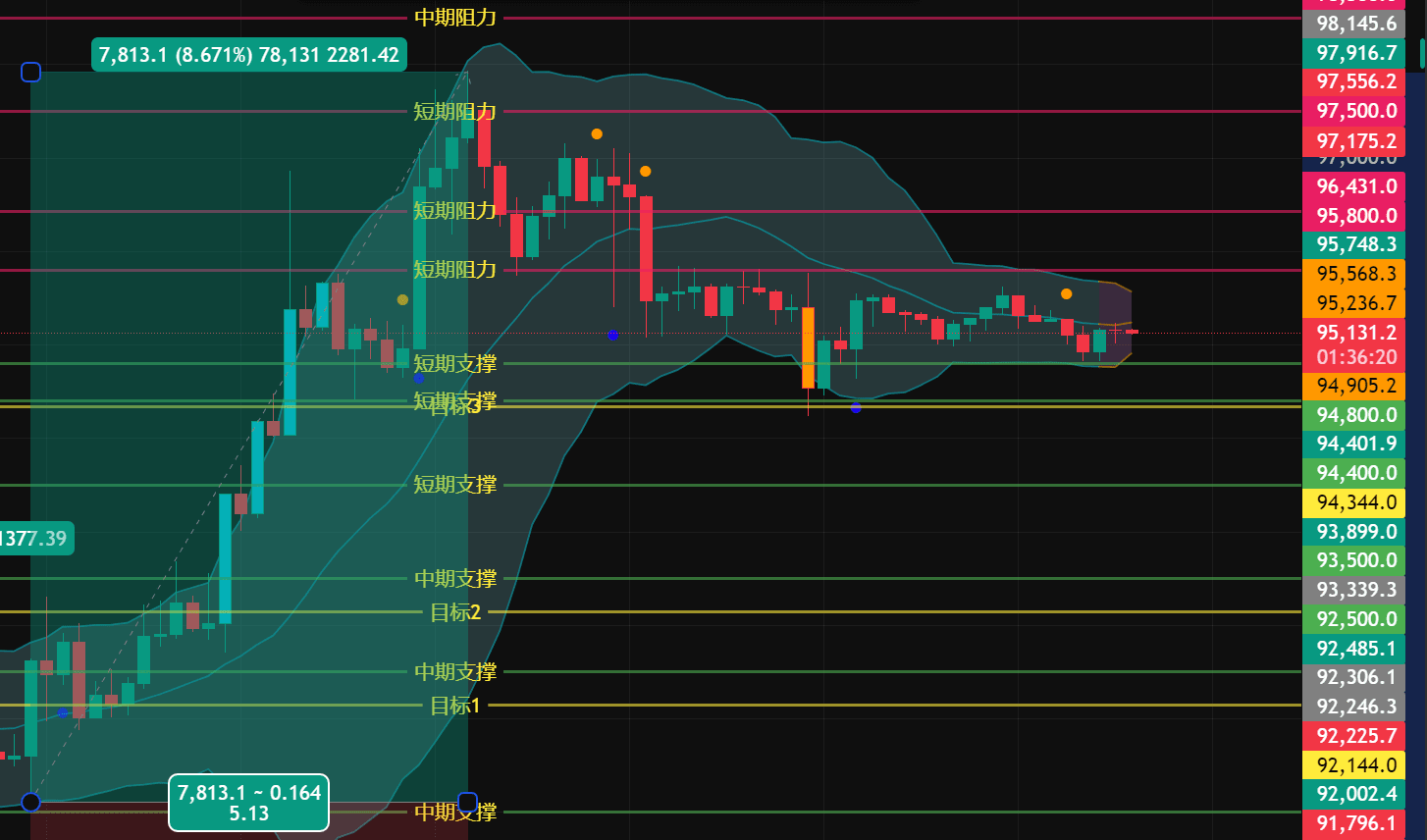 Prêt à décoller : Ce type de mouvement de "consolidation à un niveau élevé sans baisse" est généralement un modèle de continuation dans un marché haussier. Le marché digère les prises de bénéfices après avoir atteint un nouveau sommet (97940) jeudi, tout en utilisant le temps pour échanger de l'espace afin de corriger les indicateurs de surachat à court terme.