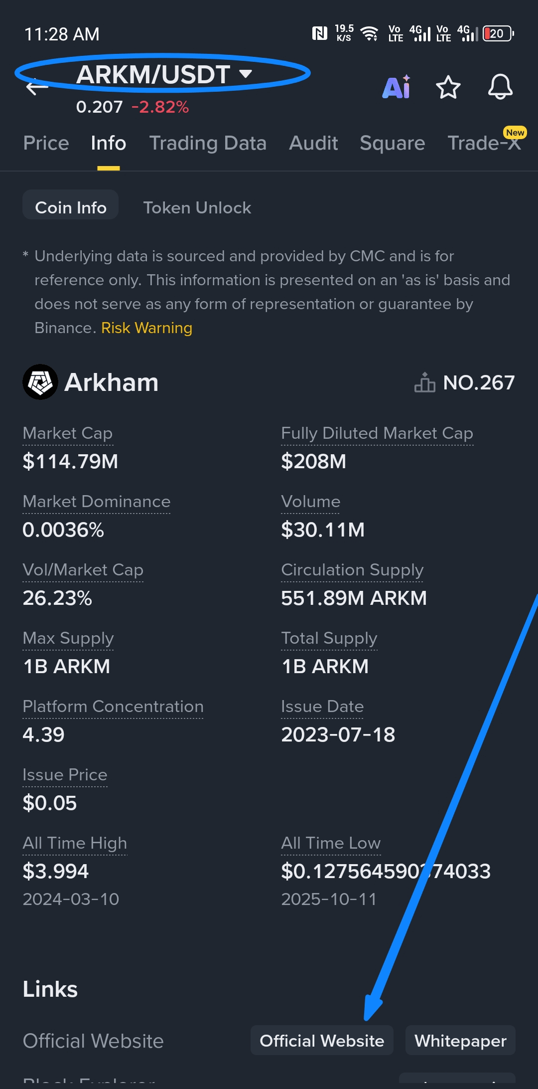 Allez dans les informations du spot $ARKM coin via l'application Binance et il est écrit site officiel, cliquez là .