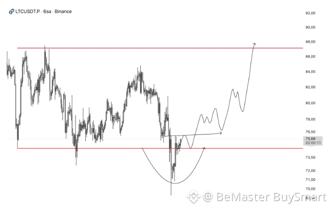 👉 Litecoin has been trading inside a clearly defined range after prolonged downside pressure. The asset remains in a long-standing downtrend but now shows tentative signs of attempting to regain strength. The chart highlights repeated reactions between a lower boundary near the mid-$70 area and an upper resistance zone in the high-$80 region, suggesting price currently respects established range levels rather than breaking into new territory.