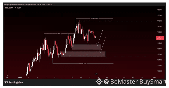 $SOL Solana retraces toward demand zones after recent rally, with traders monitoring the $140 and mid-$130s levels for potential long entries on lower timeframe confirmation.