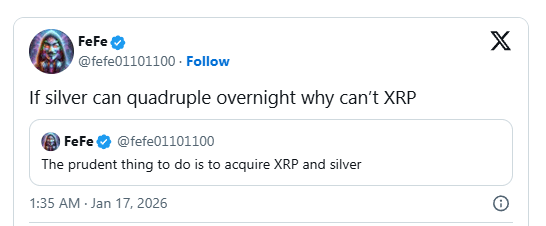 Cela suit une recommandation antérieure où FeFe a souligné que l'acquisition de XRP maintenant reste un mouvement prudent. Son dernier post signale une attention croissante sur le potentiel parallèle de XRP et de l'argent.