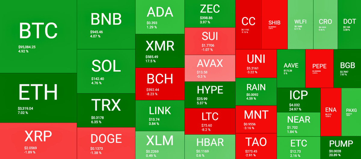Sur une échelle hebdomadaire, Ethereum (ETH) s'est démarqué, avançant d'environ 7 % pour se négocier au-dessus de 3 300 $. BNB, SOL, LINK et TRX ont également clôturé la semaine en territoire positif. Pendant ce temps, XRP, DOGE, BCH et LTC ont sous-performé.