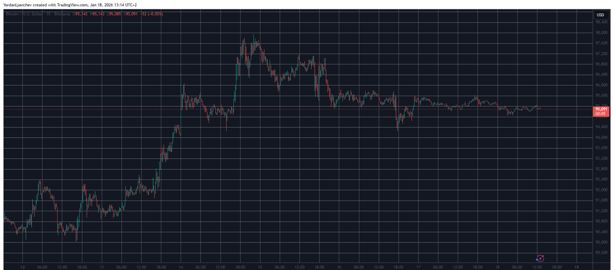 Bitcoin a passé le week-end dans un schéma de maintien familier, flottant juste au-dessus de la barre des 95 000 $ avec une volatilité minimale. Pendant près de 36 heures, l'action des prix est restée calme — une répétition du trading paresseux observé le week-end précédent.