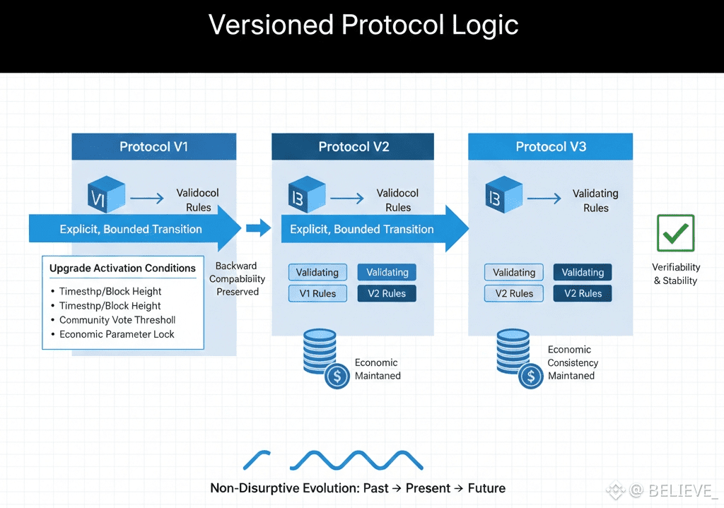 A key mechanism enabling this stability is versioned protocol logic. Instead of replacing rules wholesale, Dusk introduces new logic alongside existing rules, allowing the network to transition forward without invalidating historical assumptions. Nodes are never forced into ambiguous states where old and new interpretations conflict. Every transition is explicit, bounded, and verifiable at the protocol level.