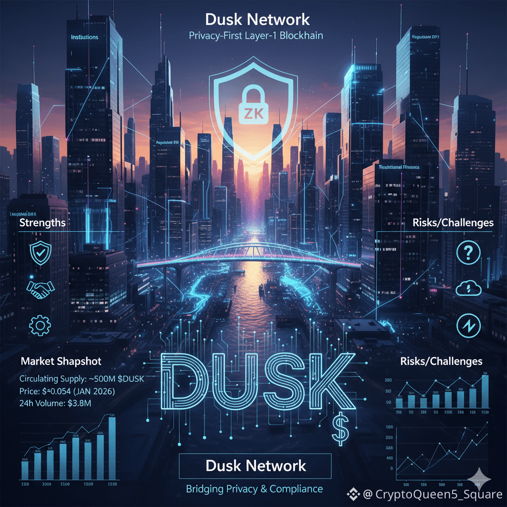 Dusk Network ($DUSK) is a privacy-first Layer-1 blockchain designed for regulated financial applications, enabling confidential transactions, tokenized securities, and compliance-friendly DeFi through zero-knowledge proofs and unique consensus mechanisms.