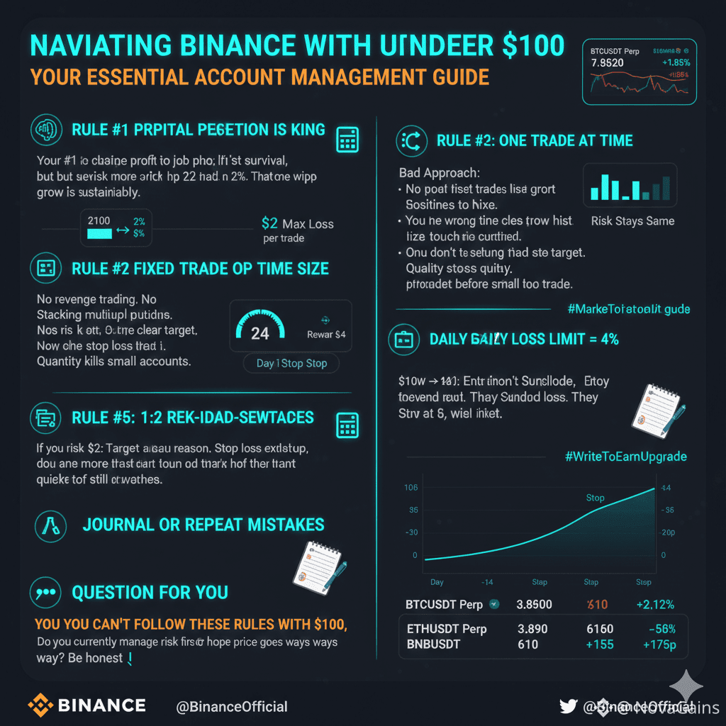 Managing an account on Binance with $100 or less requires discipline and smart strategy. Forget big, quick gains; focus on survival and steady growth.