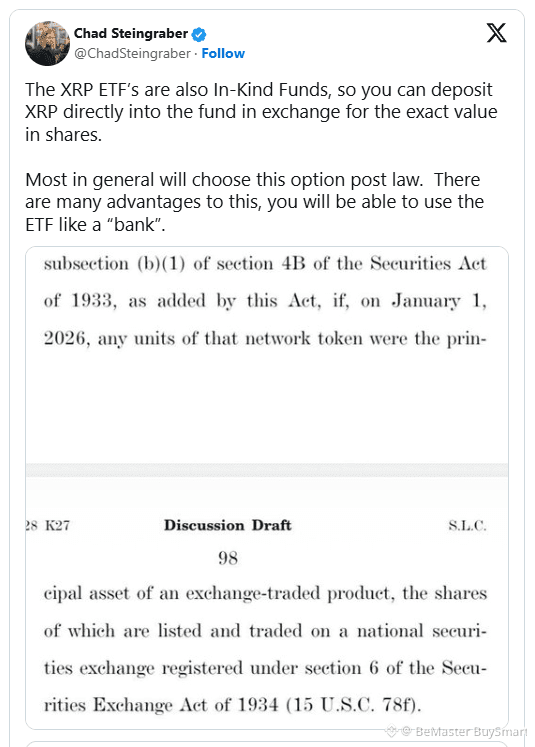 Discussion around XRP ETFs gained traction after commentary from XRP community analyst Chad Steingraber, who highlighted the structure of in-kind ETF mechanisms. In such models, the underlying asset is exchanged directly for fund shares, rather than being converted into cash first. Steingraber argued that this setup creates flexibility that could appeal to long-term holders once regulatory standards are firmly established.