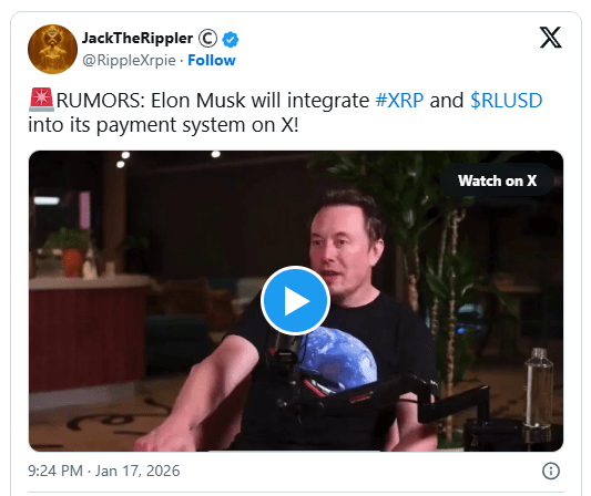 Dans le clip, Musk a décrit X comme pouvant devenir l'un des plus grands systèmes financiers du monde, fonctionnant non pas comme une banque traditionnelle mais comme une base de données ultra-efficiente et en temps réel pour l'argent, avec une fraude minimale et une gestion transparente de toute l'activité financière en un seul endroit. Le post a alimenté des rumeurs selon lesquelles XRP et la stablecoin adossée au dollar de Ripple, RLUSD, pourraient jouer un rôle dans cette vision.
