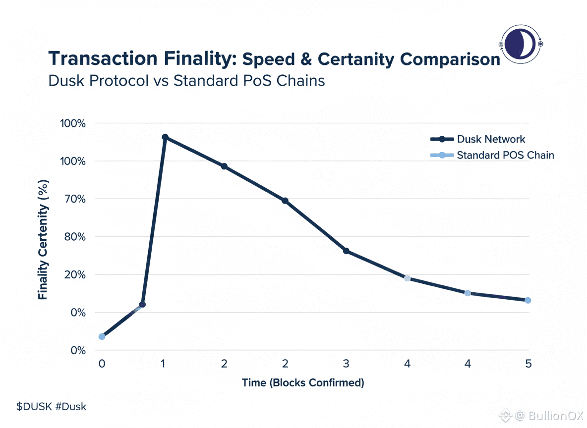 This is significant to financial applications. Premature finality assumptions may cause risks in regulated finance. Dusk can avoid this by having one block finality in normal operation no reorgs exposed to users. The state, once ratified, becomes permanent, and there are proofs of the agreement of the whole committee. However, operational blindness is used to ensure that individual nodes do not overcommit, which causes cascading errors before that.
