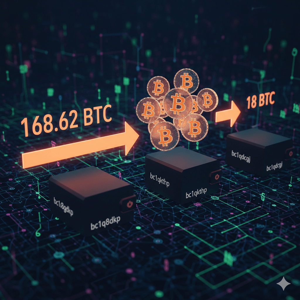 Le transfert initial a vu une somme substantielle se déplacer d'une adresse identifiée comme bc1q8gdkp vers un autre portefeuille obscur, bc1qkthp. Cette deuxième adresse a ensuite rapidement déchargé 18 $BTC vers une autre destination anonyme, bc1qdcgj.