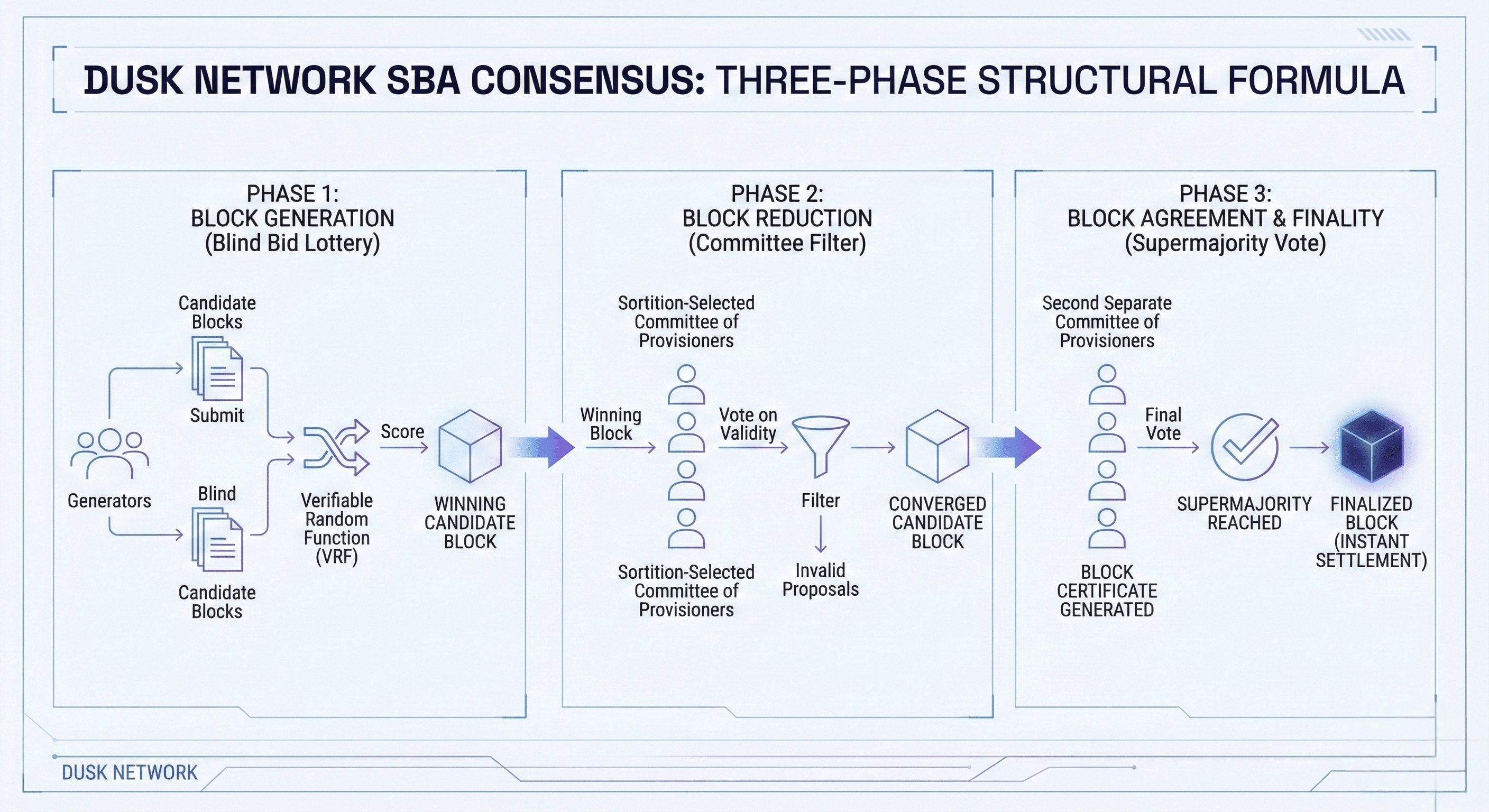 Au lieu de compter sur l'incertitude ou d'attendre plusieurs confirmations, Dusk utilise un processus structuré en trois phases. Chaque phase a un rôle clair, et ensemble, elles garantissent qu'une fois qu'un bloc est finalisé, il est réglé avec certitude.