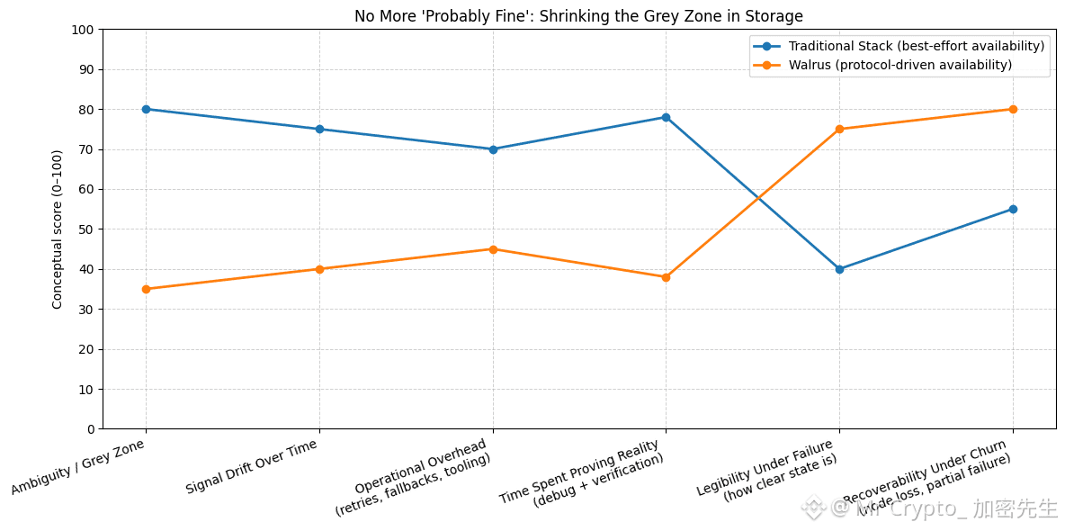 That is why the difference matters. Reliability is a metric. Removing ambiguity is a design choice. And when you make that choice at the storage layer, the whole stack becomes calmer. Not because nothing ever goes wrong, but because when something changes, the system stays legible. That is how infrastructure grows older without falling apart.