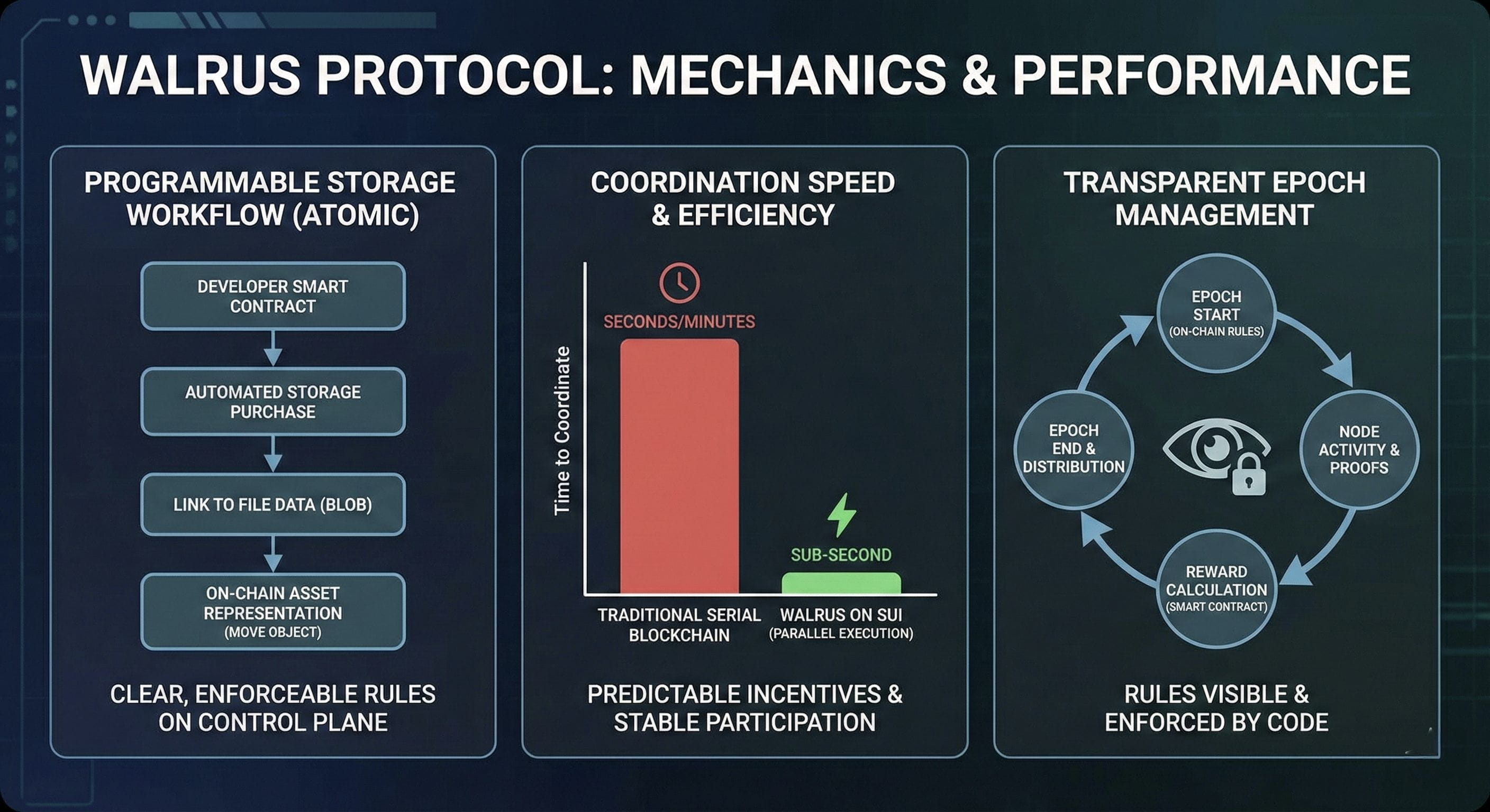 Epoch management is also handled with a level of transparency that I find refreshing. The Walrus network operates in defined epochs, and all the logic that governs those epochs lives in smart contracts on Sui. This includes which nodes are active, how availability proofs are evaluated, and how rewards are distributed. I tell you clearly, this removes a lot of ambiguity. Participants do not have to trust an opaque off-chain coordinator. The rules are visible and enforced by code.