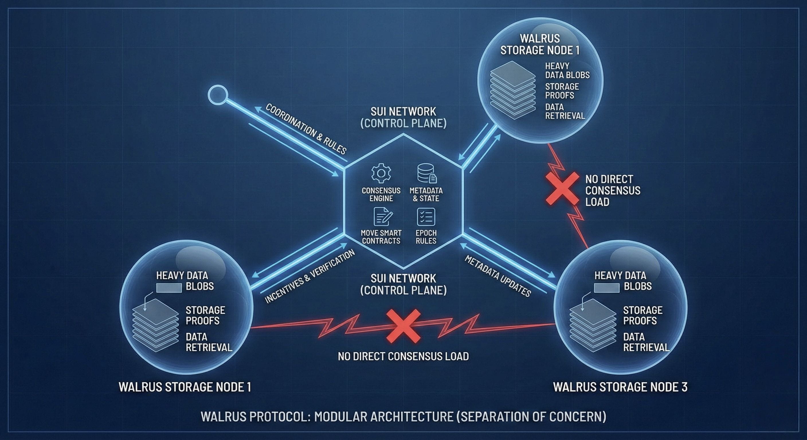 As I researched further, I realized Walrus treats coordination as a separate problem from storage. Instead of reinventing consensus, they rely on Sui Network as a control plane. I tell you honestly, this feels closer to how real distributed systems are built outside crypto. One layer handles fast, reliable coordination, while another focuses on heavy operational work. Walrus applies that logic cleanly by letting Sui manage metadata, state, and rules, while Walrus nodes handle the actual data.