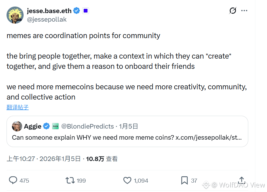 Base链创始人Jesse Pollak提供了一个有趣的视角。他多次强调Meme不仅是投机工具,更是"链上文化的核心"。通过图片、视频、音乐等内容形式,Meme能够吸引数百万新用户上链,成为Web3大规模采用的入口。