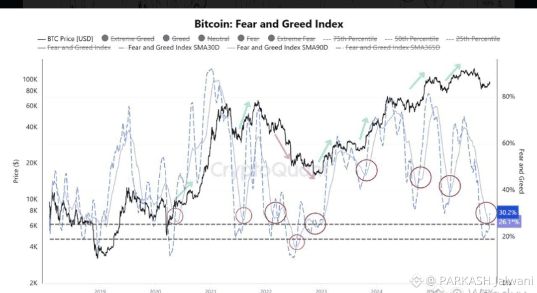 Fear & Greed is hovering around ~30 — not euphoria, not mania, but skepticism beginning to crack. That’s the key. Historically, sentiment turns before price does, often weeks in advance. The crowd feels better first… then price follows.