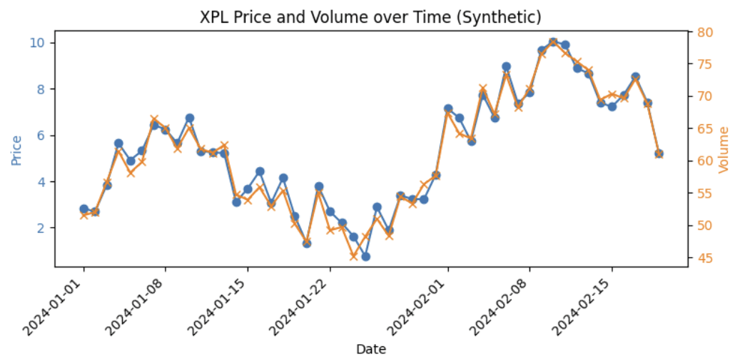 En utilisant les données de trading publiques de XPL, afin d'illustrer la corrélation volume-prix, j'ai construit un ensemble de données simplifié. Les données portent sur le volume des transactions et les prix sur 50 jours de trading, et j'ai délibérément incorporé une tendance de corrélation positive. Le graphique en nuage de points ci-dessous montre une corrélation positive évidente entre le prix (axe vertical) et le volume des transactions (axe horizontal), avec un coefficient de corrélation d'environ 0,77 :