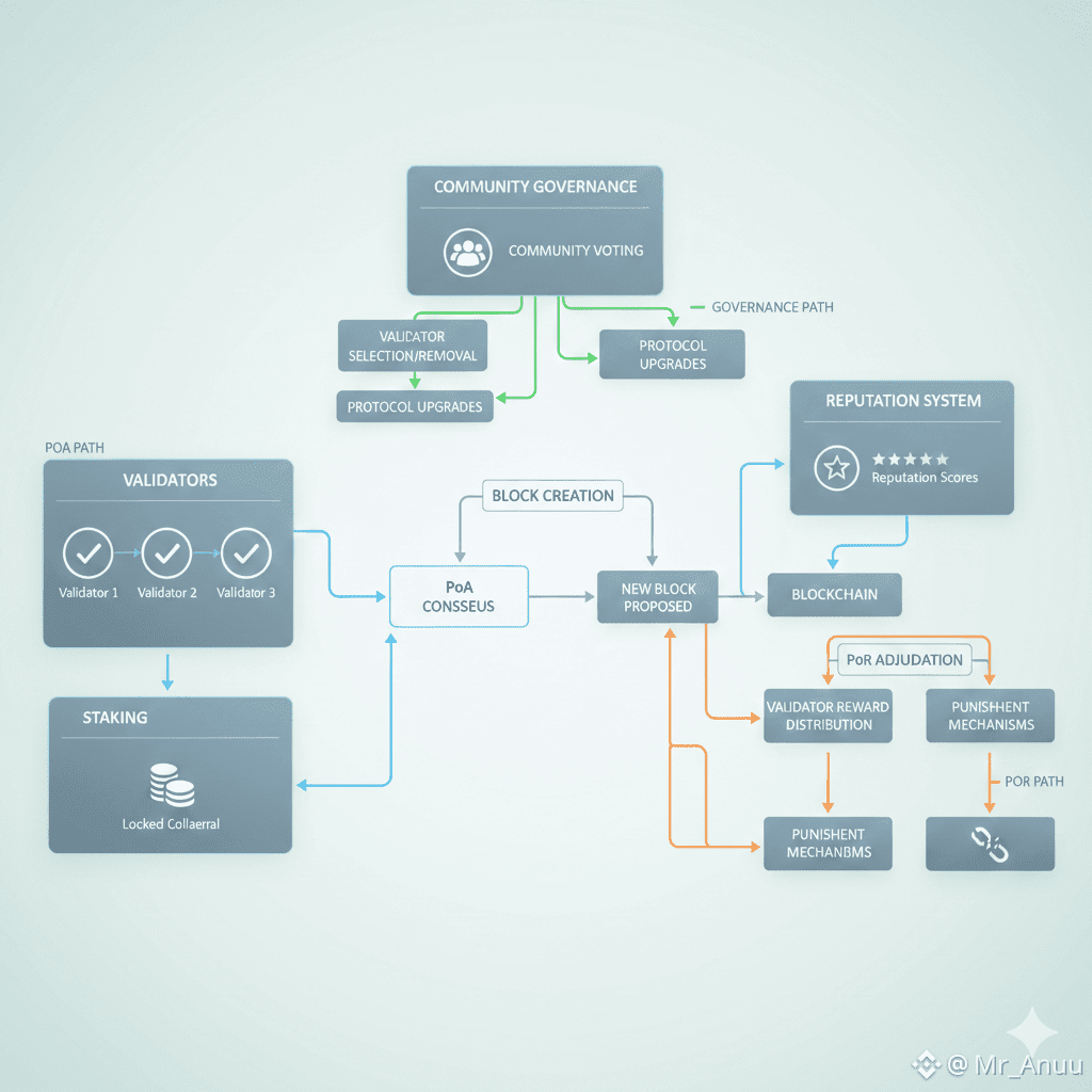 Vanar uses Proof of Authority (PoA) and Proof of Reputation (PoR) to maintain network integrity. Initially, trusted validators operate the chain, ensuring stability. Over time, community members gain reputation and voting power, progressively decentralizing governance. Staking and delegated staking allow token holders to participate in network security and validator selection. This combination ensures both security and long-term scalability, making Vanar a blockchain that grows responsibly with its community.