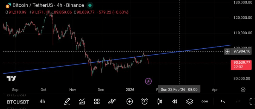 $BTC Le graphique de 4 heures n'offre pas exactement un coup de pouce en confiance. Le Bitcoin a chuté fortement depuis la zone des 95 000 $, traçant un chemin de bougies rouges agressives en cours de route. Bien que le prix ait réussi un petit rebond près de 90 600 $, la reprise semble fragile au mieux. La consolidation actuelle ressemble plus à un contrôle des dommages qu'à une force. À moins que le BTC ne puisse reprendre 92 000 $ avec un volume convaincant, le momentum à la hausse reste sur la glace fine. Les traders à court terme peuvent surveiller la zone de 90 600 $ pour des jeux rapides, mais se précipiter ici est plus risqué que gratifiant.