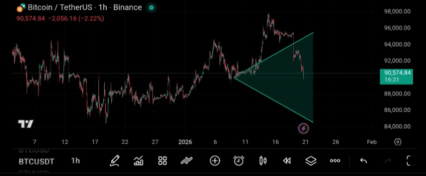 En zoomant sur la période de 1 heure, le marché reste coincé dans une tendance baissière persistante avec très peu de résistance haussière. La chute à 90,599 $ s'est accompagnée d'une augmentation notable du volume, suggérant une éventuelle exhaustion du côté des ventes. Depuis lors, le prix a dérivé latéralement, signalant une hésitation plutôt qu'un retournement. Une rupture décisive au-dessus de la zone de 91,500 $–91,800 $, soutenue par un volume fort, est nécessaire pour briser cette impasse. D'ici là, l'incertitude règne sur le marché.