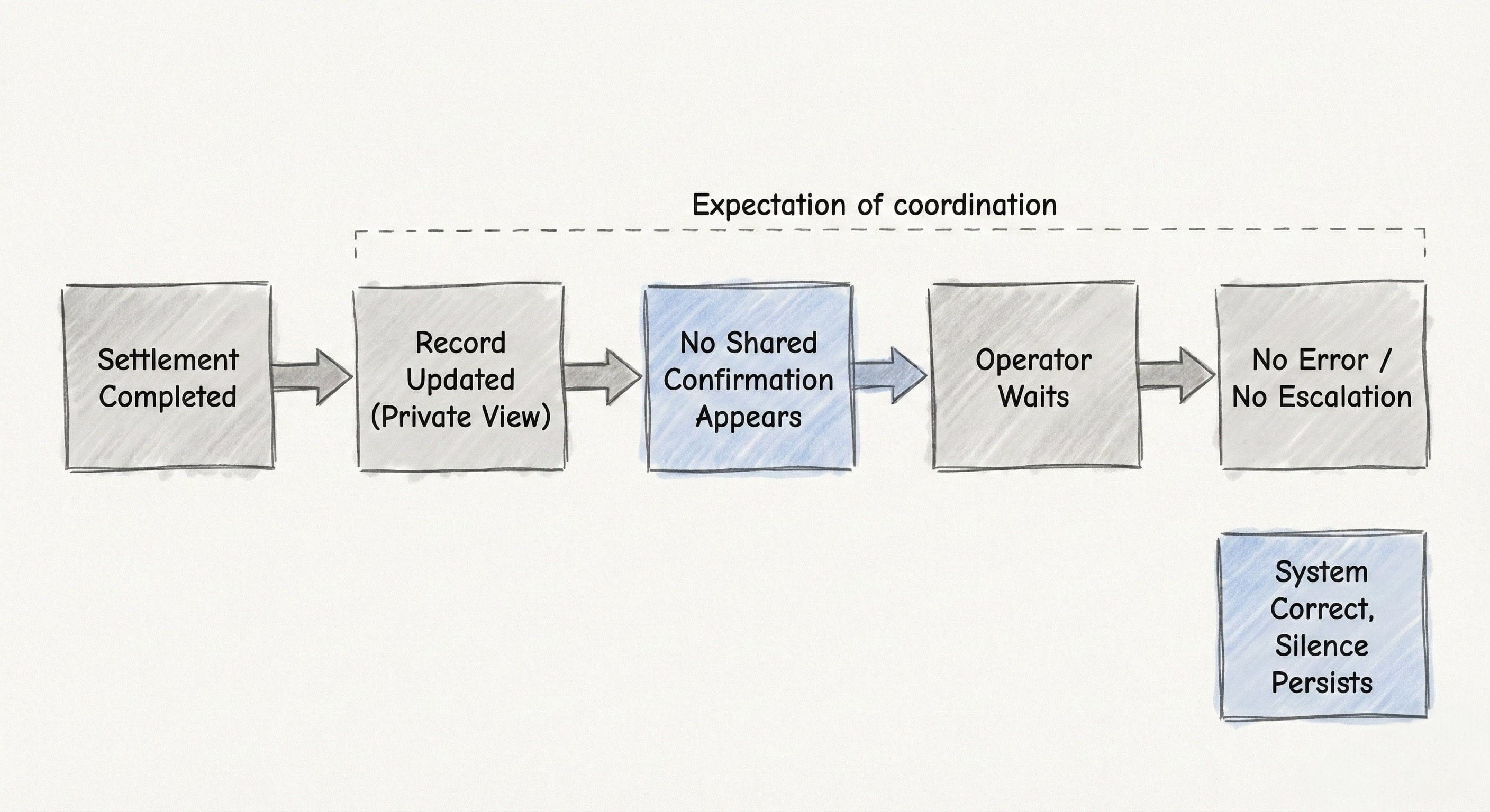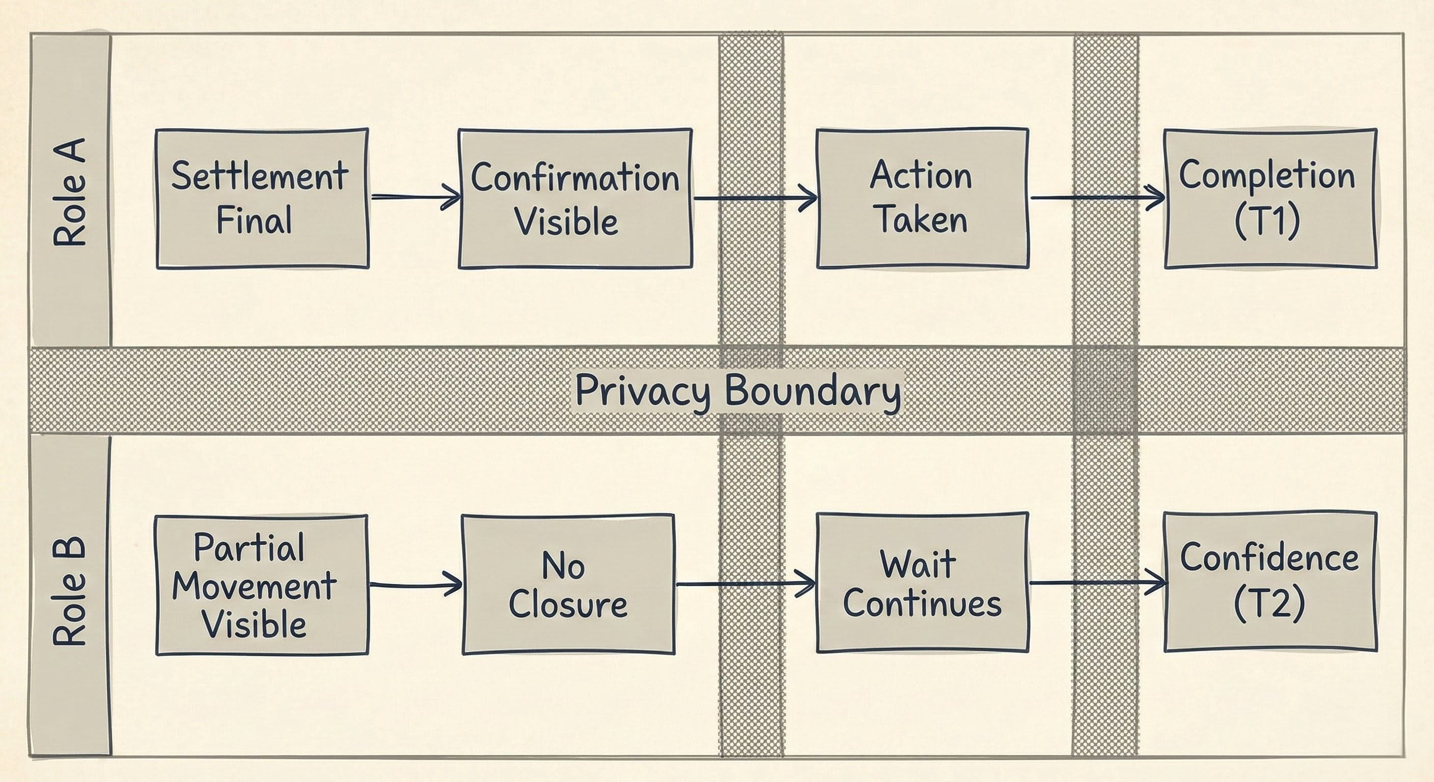 Elsewhere, another role is watching a different surface. They see movement, but not closure. The confirmation they need exists, but outside their permitted scope. They cannot pull it forward without changing the file. They do not block, because blocking requires a reason that can be stated without breaking Dusk privacy.