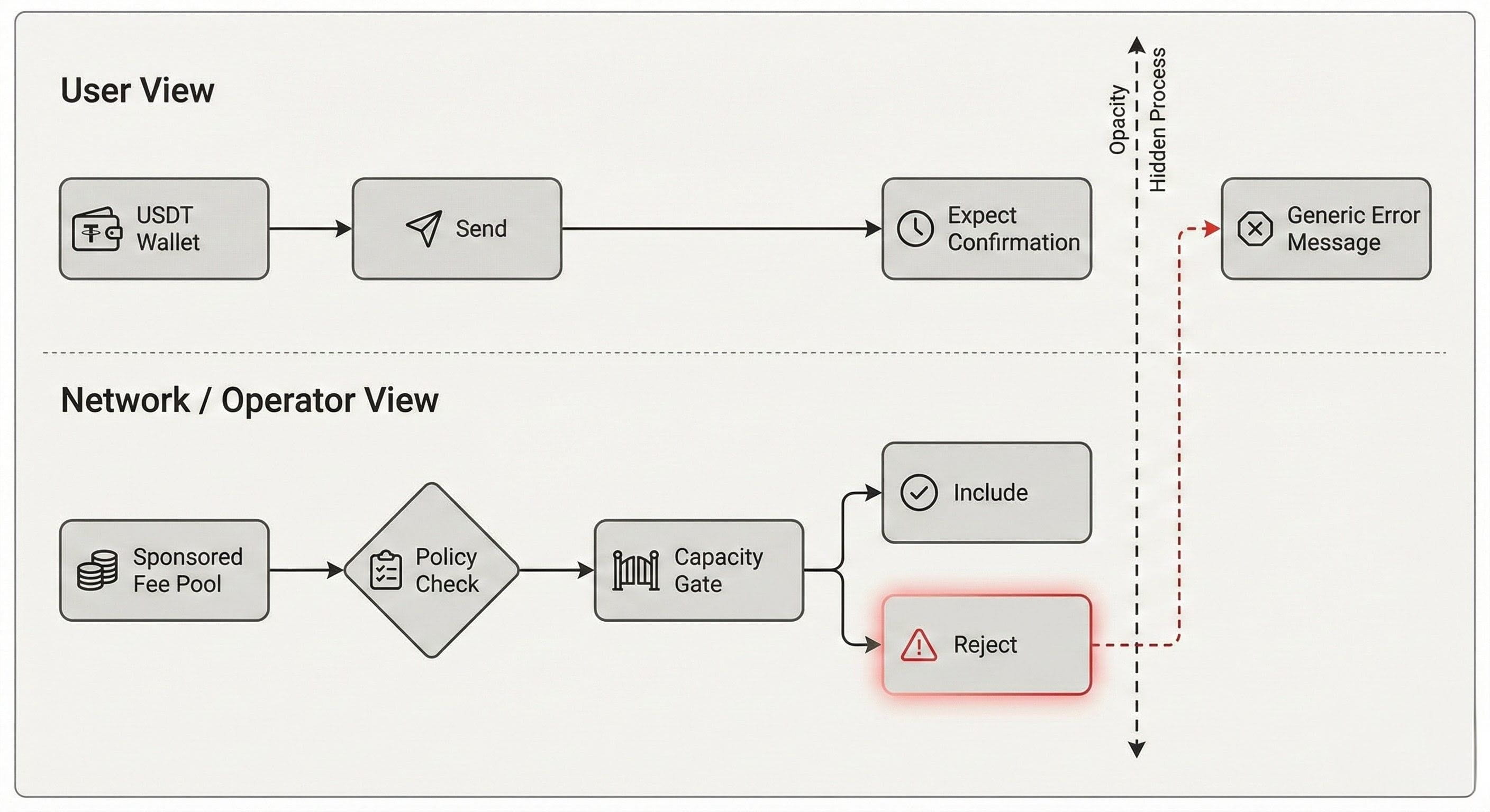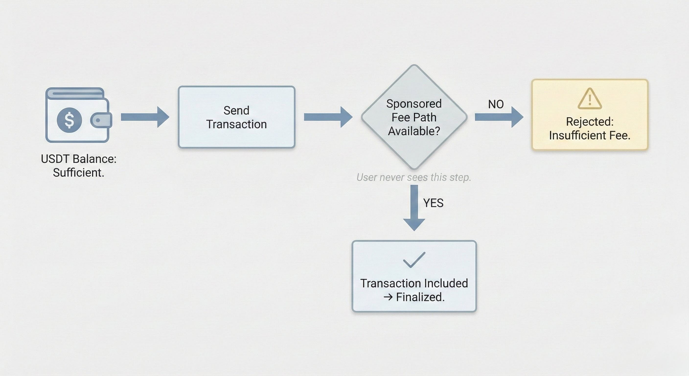 Vous ne pouvez pas dire à quelqu'un d'attendre que les frais baissent parce qu'il n'y a pas de marché de frais public qu'il peut voir. La tarification est interne. L'inclusion est une politique. Lorsque le chemin sponsorisé se resserre, le devis que vous pensiez être validé ne l'est tout simplement pas. L'utilisateur a toujours des USDT, et il ne peut toujours pas payer.