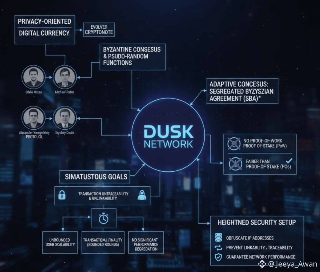 The Dusk network makes use of a decentralized and privacy-oriented digital currency that evolves the CryptoNote protocol throughthe groundbreaking discoveries in the fteld o f Byzantine consensus and pseudo-random functions of world renown cryptographers such as Silvio Micali, Michael Rabin, Alexander Yampolskiy and Evgeniy Dodis. Dusk radically departs from any other blockchain by employing an adaptive consensus mechanism, called Segregated Byzantine Agreement (or SBA), which does not require the com- putational intensity of proof -of -work and is a fairer alternative to proof -of -stake. Built on such consensus algorithm, Dusk is poised to be the first to simultaneously achieve previously conficting goals of guaranteeing transaction untraceability and unlinkability, safeguarding user privacy, reaching transactional "finality" a ter a bound number of rounds within a single block election and achieving virtually unbounded user scalability without any signifcant performance degradation. The Dusk network requires a heightened security setup designed specifcally to: