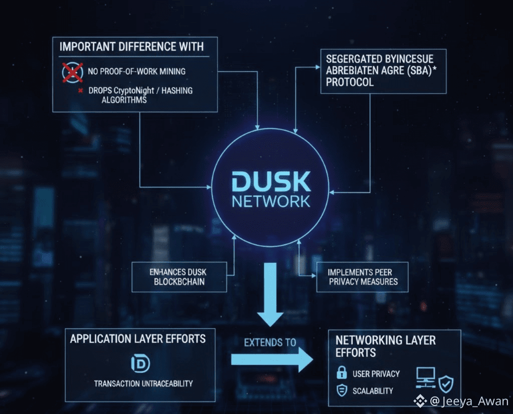 An important difference with CryptoNote, is that Dusk doesnot make use of proof-of-work mining and therefore drops completely CryptoNight and deviates substantially from the hashing algorithms therein adopted. In particular, Dusk uses what we call Segregated Byzantine Agreement (SBA) protocol which enhancesclassic BA by implementing specific measures to protect peer privacy. SBA has been developed specifically to power the Dusk Blockchain and help meeting the aforementioned requirements. These efforts do not solely relate to the application layer but extend to the networking layer as well.
