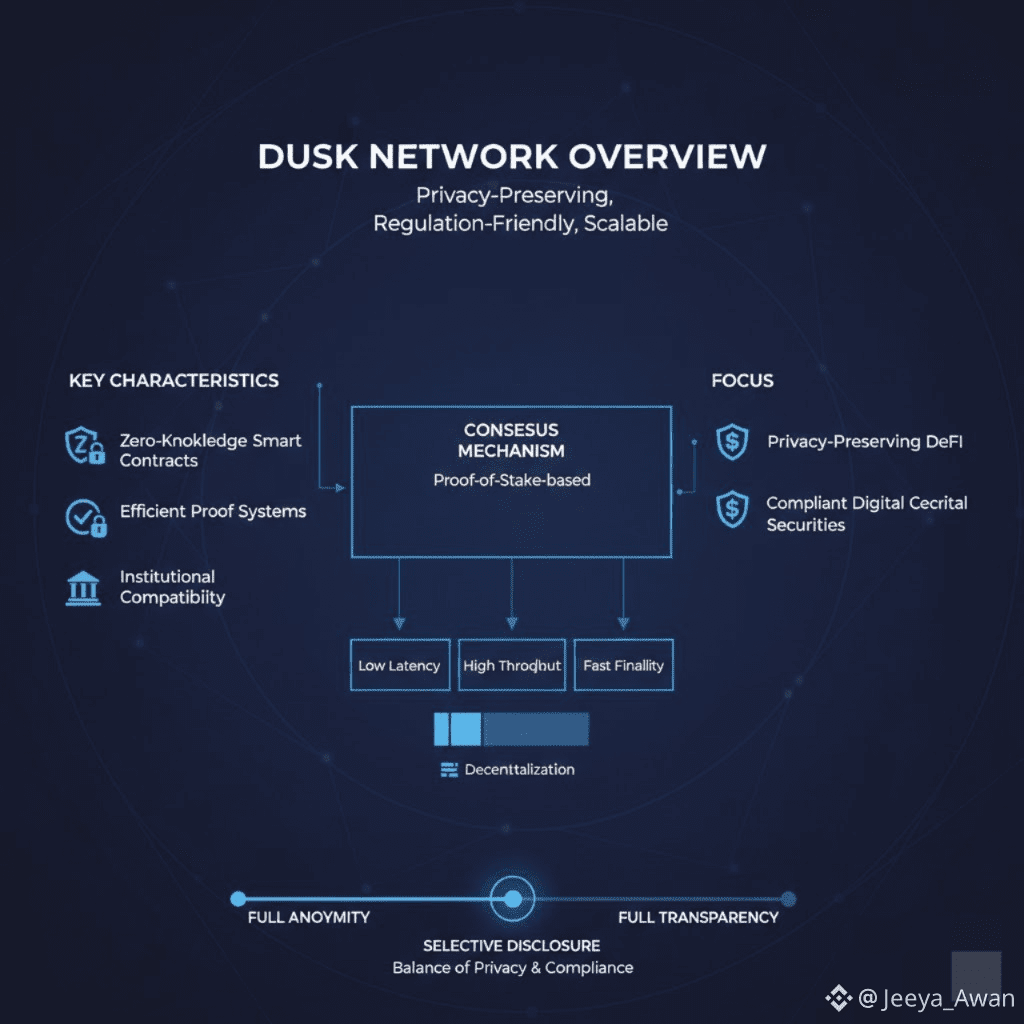 Dusk Network is a Layer-1 blockchain focused on enabling privacy-preserving decentralized finance (DeFi) and compliant digital securities. Unlike many privacy coins that rely on full anonymity, Dusk aims for selective disclosure, allowing users to prove compliance without revealing sensitive data.