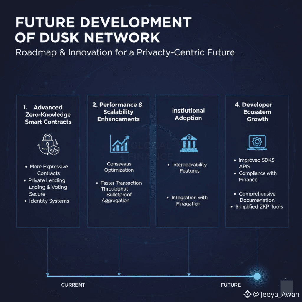 Dusk’s future development focuses on expanding functionality, improving scalability, and strengthening privacy infrastructure. Several key areas define its roadmap: