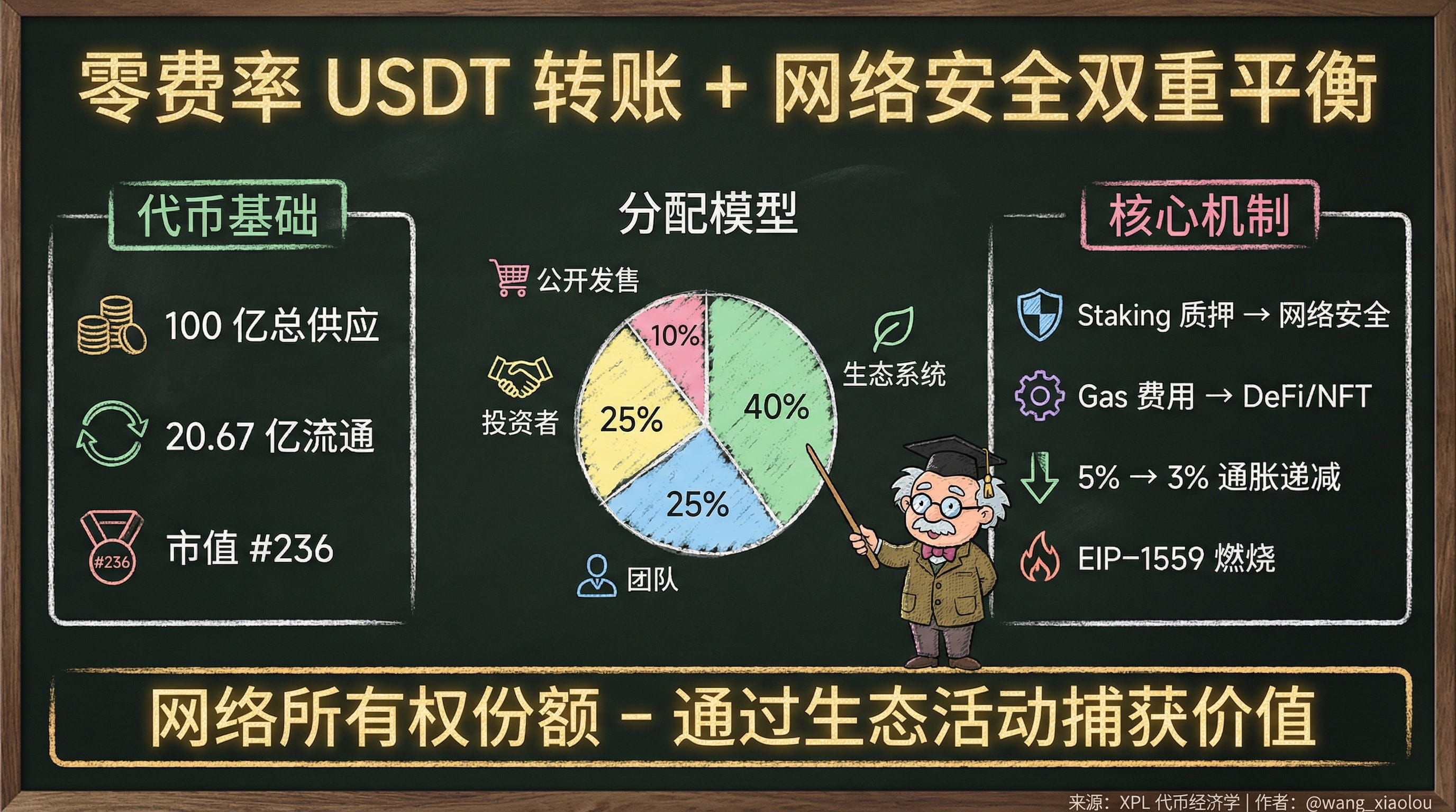 作为专为稳定币支付设计的 Layer 1 区块链,Plasma Network 不仅以「零 Gas 费 USDT 转账」切入市场,更通过其原生代币 XPL 构建了一套精密平衡的经济模型。本文将深入剖析 XPL 的代币经济学(Tokenomics),解读其如何在降低用户门槛与保障网络安全之间找到平衡点。