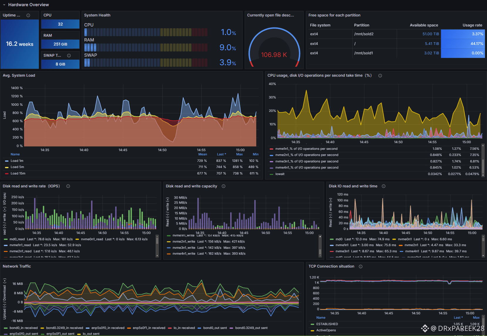 That is why Walrus integrates a monitoring stack based on Grafana, Prometheus, and Node Exporter. Prometheus works as the time-series engine that collects and stores metrics. Node Exporter provides deep visibility into hardware and operating system performance. Grafana acts as the visual command center where all metrics come together in a clean dashboard interface. When these pieces work together, an operator can understand not only whether services are running, but also how efficiently they are running and what risks are building up under the surface.