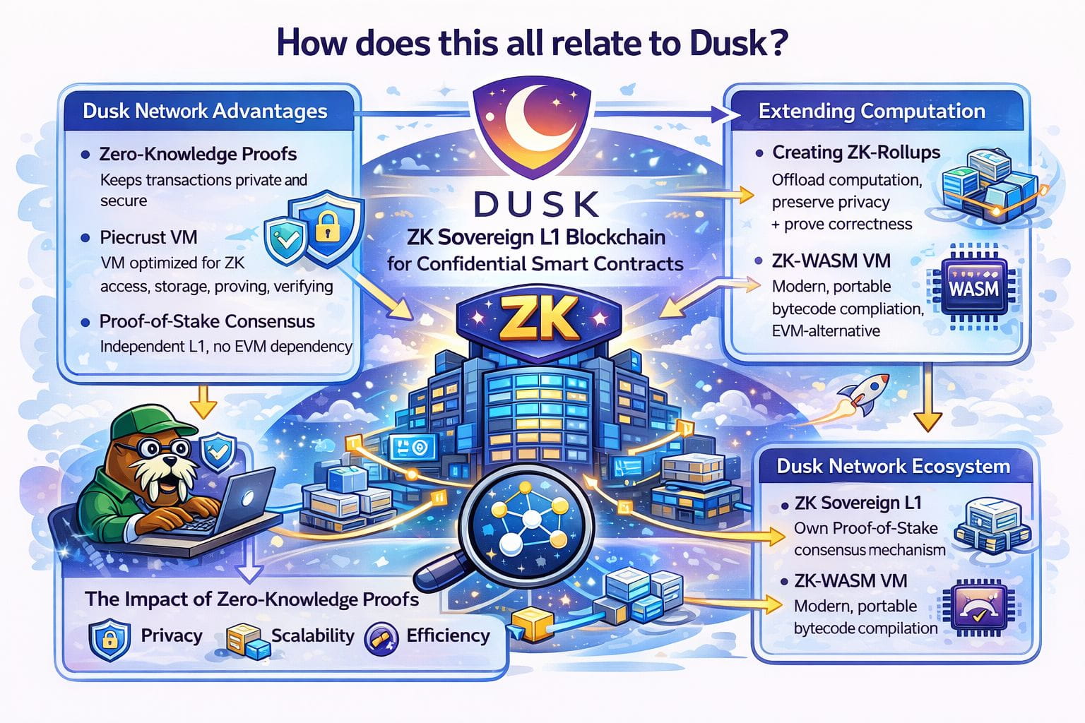 Now here’s where the ecosystem story gets really interesting. Dusk isn’t just a closed system—it’s a platform that can be extended. For third-party builders, there’s a clear pathway to expand computation and scalability through ZK-rollups and ZK-VMs that connect back to the network. This approach would allow heavy computation to happen externally while still providing verifiable correctness to the main chain. That’s the future of scalable privacy: offload what’s expensive, prove what’s true, and keep the core chain efficient and secure. In this context, a ZK-WASM VM becomes a fascinating possibility, because it could act as a bridge toward solutions that feel “ZK-EVM equivalent” in capability while staying aligned with Dusk’s more modern execution stack. The big difference is that instead of copying EVM constraints, Dusk can support provable computation in a way that is cleaner, more forward-looking, and more adaptable.