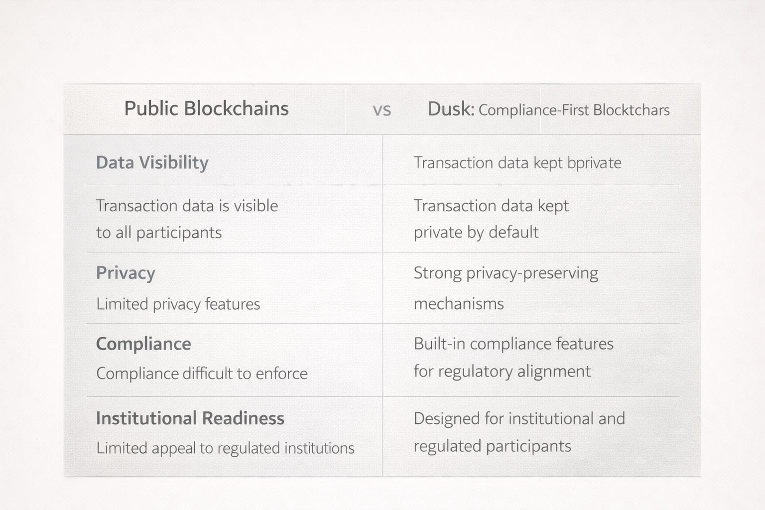 I have dug into Dusk's protocol papers and read what outside auditors have to say. The bottom line? Regulators and auditors can still verify transactions but the people involved stay out of the spotlight. Messari's 2024 infrastructure report even called out privacy first compliance blockchains as one of the hottest areas in crypto research right now even if most regular users are not paying much attention yet. This matters more than people realize. According to the European Central Banks 2023 distributed ledger analysis financial institutions cannot legally transact on ledgers where sensitive trade data is globally visible. That is not a technical limitation. It's a legal one. Dusk does not just work around this constraint. It builds everything with it front and center. A chart that lays out transactions on Ethereum next to those on Dusk step by step showing exactly when each platform reveals data or imagine a graphic that breaks down how zero knowledge proofs take the place of old school disclosure during settlements. Stuff like this makes it obvious how Dusk stands apart. It's not just about a different philosophy is the whole structure changes.