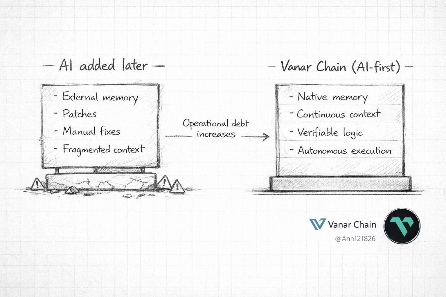 Muchas blockchains han empezado a hablar de inteligencia artificial sin cuestionar si su arquitectura puede sostenerla en el tiempo La IA se incorpora como una integración adicional mientras la base del sistema sigue pensada para interacciones humanas ejecuciones aisladas y estado fragmentado Este enfoque suele funcionar en etapas tempranas pero introduce una forma específica de deuda técnica que no se hace evidente hasta que el uso deja de ser experimental.