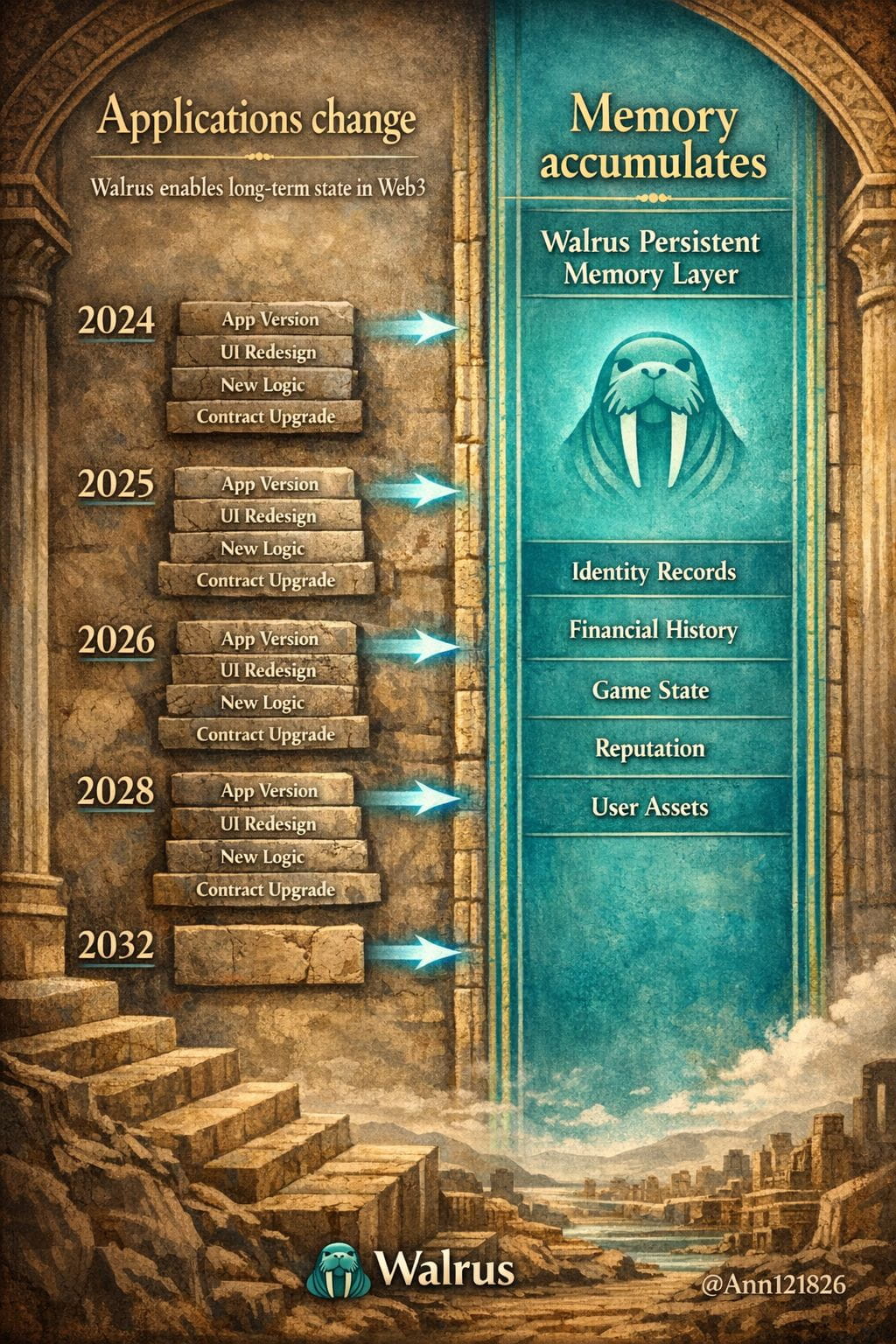 Walrus no solo añade almacenamiento descentralizado. Introduce continuidad técnica entre generaciones de software en un entorno donde todo solía ser descartable. Cuando las aplicaciones dejan de ser contenedores temporales de datos y se convierten en capas intercambiables sobre una base persistente, Web3 empieza a parecerse menos a una sucesión de experimentos frágiles y más a una plataforma donde vale la pena construir durante años.