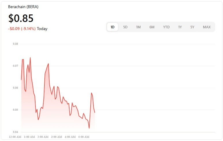 $BERA se négocie autour de $0.85–$0.88 et a montré une forte volatilité récemment. Le prix a rebondi sur des bas récents mais peine encore à franchir la résistance supérieure. Les notations techniques varient selon la plateforme, montrant des signaux mitigés avec un biais vers la vente à court terme et plus neutre à acheter dans certains indicateurs.