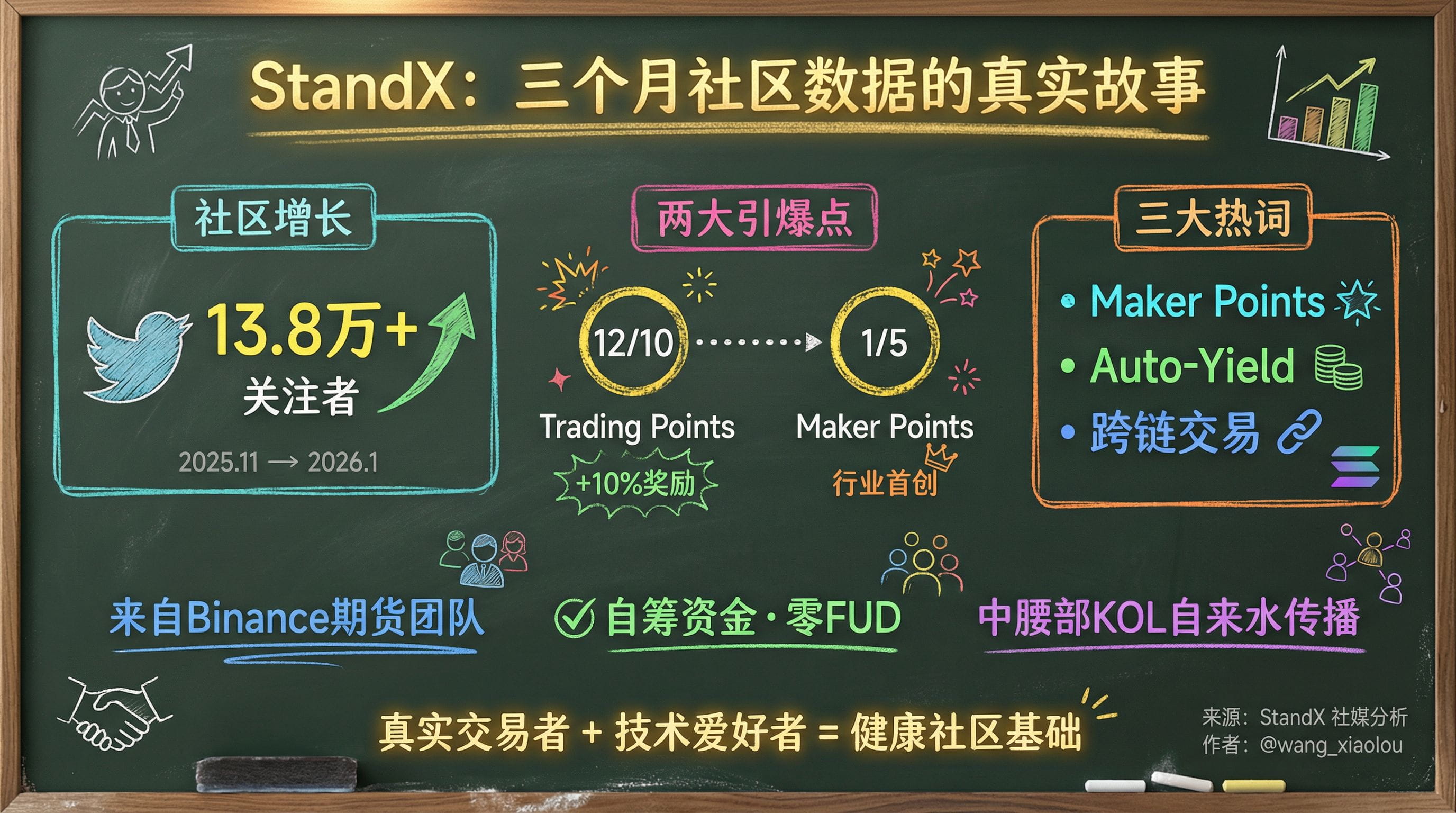 结论: 在过去三个月里,StandX 凭借其扎实的产品创新(如 Maker Points 和自动收益 DUSD)和稳健的运营策略,成功凝聚了强大的社区势能。这个由真实交易者和技术爱好者组成的社区,表现出高度的参与感和积极情绪。这种健康的社区基础不仅为其未来可能的 TGE(代币生成事件)提供了坚实支撑,也为项目的长期、可持续发展注入了强大的动力。
