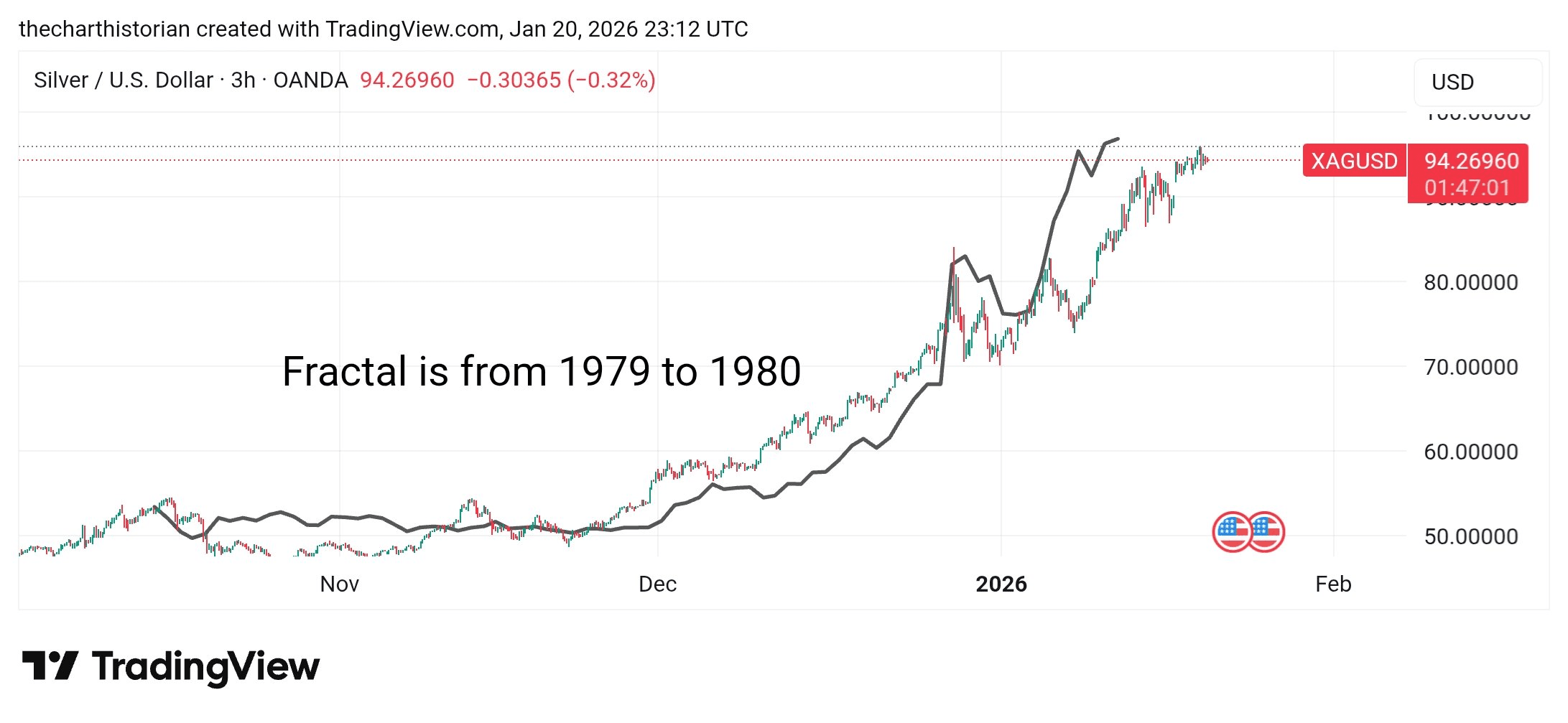Et de l'autre cÎté, nous pouvons voir en ce moment la mise à jour (Argent) sur ceci.#Silver fractal. Le fractal est le sommet du bull run de 1980. Une fois que le sommet d'aujourd'hui sera complété, l'effondrement commencera probablement.