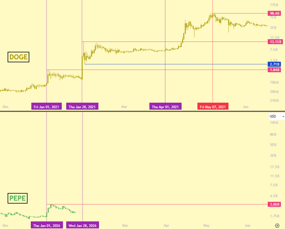 $DOGE a ensuite continué à chuter tout au long du mois de janvier, similaire à ce que $PEPE fait maintenant.