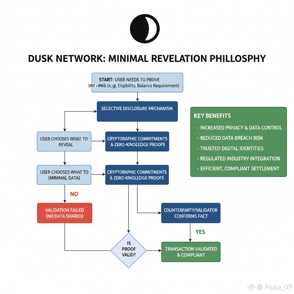 Here’s how it works:Dusk uses selective disclosure.If you need to prove something eligibility,that you meet a balance requirement,or that you’re compliant you can.But you don’t have to hand over anything else.No extra personal details,no unnecessary financial history.This happens through cryptographic commitments and zero knowledge proofs,which let users prove just what’s needed,nothing more. Counterparties and validators see enough to confirm the facts,while everything else stays private.