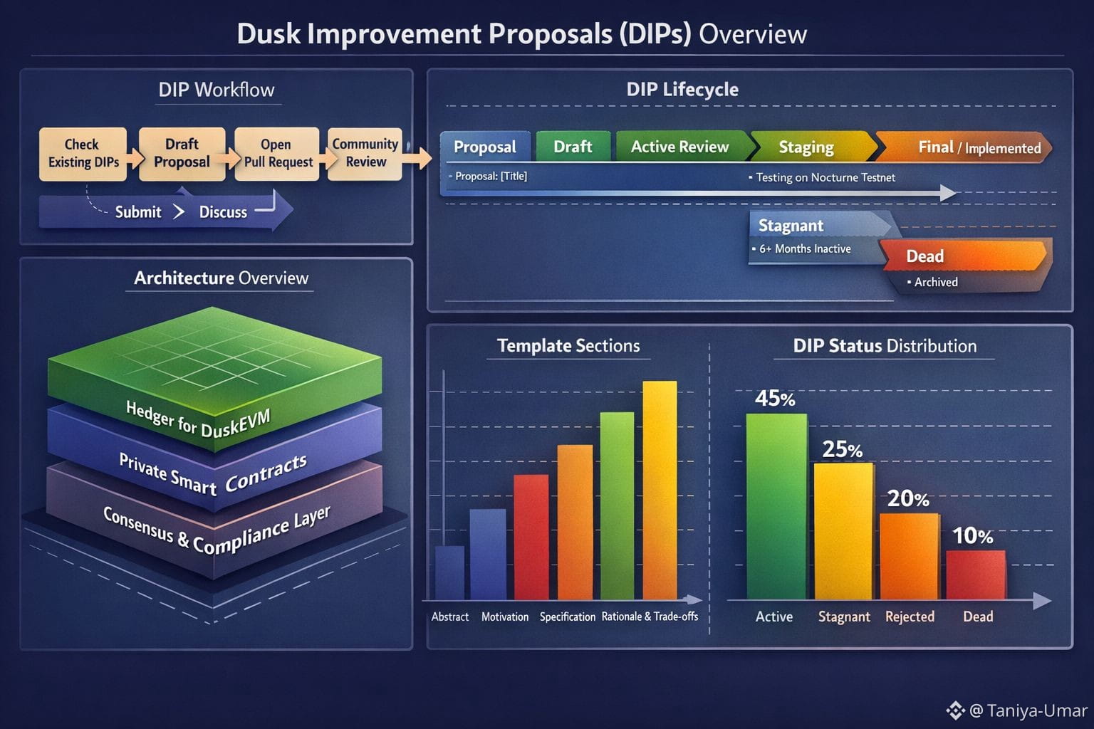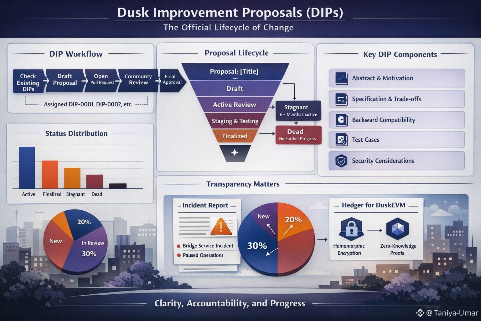 Dusk describes a DIP as a formal document for proposing a new feature, standard, or protocol adjustment, and also as a source of truth for the design decisions behind it. That second part is the real value. Technical debates often go sideways for human reasons. People remember different versions of the same discussion, or they inherit opinions without the context that shaped them. A written proposal forces clarity.
