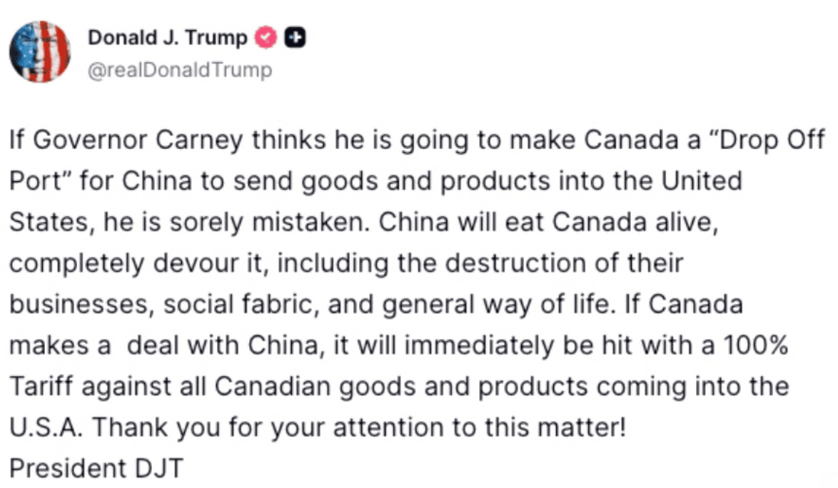 Trump a intensifié sa rhétorique commerciale contre le Canada, menaçant des tarifs de 100 % sur les importations canadiennes si le Canada procède à des arrangements commerciaux limités avec la Chine. La préoccupation exprimée est d'empêcher le Canada d'agir comme un conduit pour les biens chinois vers les États-Unis, réintroduisant l'incertitude de la politique commerciale malgré l'intégration économique profonde entre les États-Unis et le Canada.