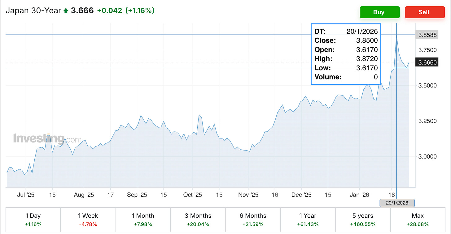 Une forte vente sur le marché des obligations d'État du Japon a déclenché une re-évaluation plus large du risque mondial. Les JGB à long terme ont conduit le mouvement, avec des rendements augmentant rapidement au milieu de changements d'attentes d'inflation et de préoccupations fiscales persistantes. Avec une dette publique dépassant 250 % du PIB, le Japon reste hautement sensible à toute perception d'expansion de la politique. Cette semaine, le JP10Y a fortement augmenté, tandis que le JP30Y a enregistré l'une de ses plus grandes augmentations quotidiennes depuis 2003, poussant les rendements à de nouveaux sommets près de 3,9 %.