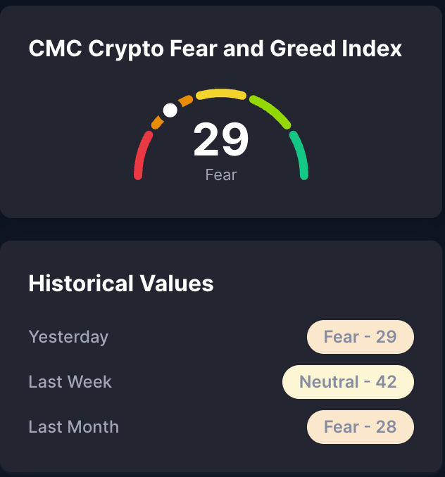 Les conditions macroéconomiques s'améliorent en surface, mais le capital reste défensif et concentré, avec une liquidité qui se resserre plutôt que de tourner. Jusqu'à ce que la clarté politique s'améliore et que les flux se stabilisent, les marchés restent vulnérables aux mouvements déclenchés par la volatilité plutôt qu'à des tendances à risque durable et larges. Cela est évident également dans l'indice de peur et de cupidité qui est actuellement à 29, en territoire de peur.