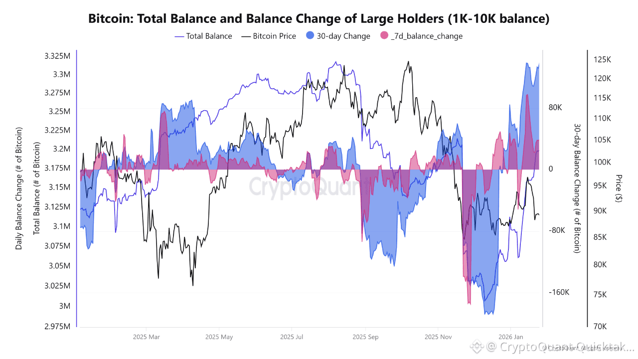 Le suivi on-chain des grands détenteurs de Bitcoin (1K–10K BTC, excluant les échanges et les mineurs) indique un changement de comportement après une longue phase de distribution jusqu'à la fin de 2025. Les soldes des baleines ont atteint un sommet autour de la mi-2025, puis ont diminué régulièrement alors que les prix restaient élevés, indiquant une vente intentionnelle dans la force plutôt que des sorties motivées par le stress.