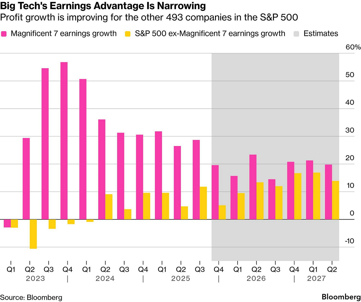 La raison sous-jacente de ce changement est une compression rapide dans le leadership des bénéfices. Les attentes consensuelles pointent désormais vers une croissance des bénéfices des Magnificent 7 d'environ 18 % en 2026, seulement légèrement supérieure à la projection de 13 % pour le reste du S&P 500. Lorsque Big Tech connaissait une croissance à des multiples du marché plus large, des valorisations premium et une concentration extrême étaient justifiées. Avec cet avantage de croissance maintenant réduit à une faible différence à un chiffre, le cas économique pour le capital se concentrant sur une poignée de gagnants s'est considérablement affaibli, faisant écho à des dynamiques similaires se déroulant entre Bitcoin et le marché altcoin plus large.
