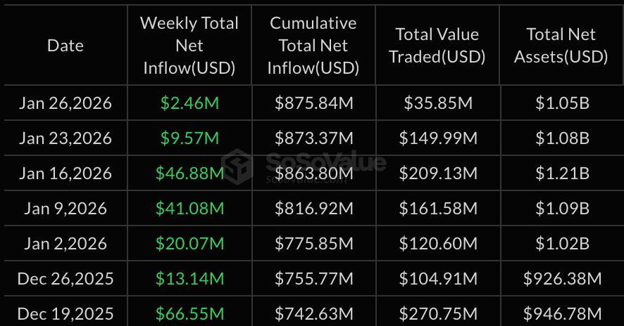 Les ETF Solana étaient les exceptions claires, terminant la semaine avec 9,57 millions de dollars d'entrées nettes malgré un environnement de risque général. Le FSOL de Fidelity a mené la demande avec 5,28 millions de dollars, tandis que le BSOL de Bitwise, le VSOL de VanEck et le GSOL de Grayscale ont également vu des entrées régulières, compensant plus qu'un léger recul du TSOL de 21Shares.